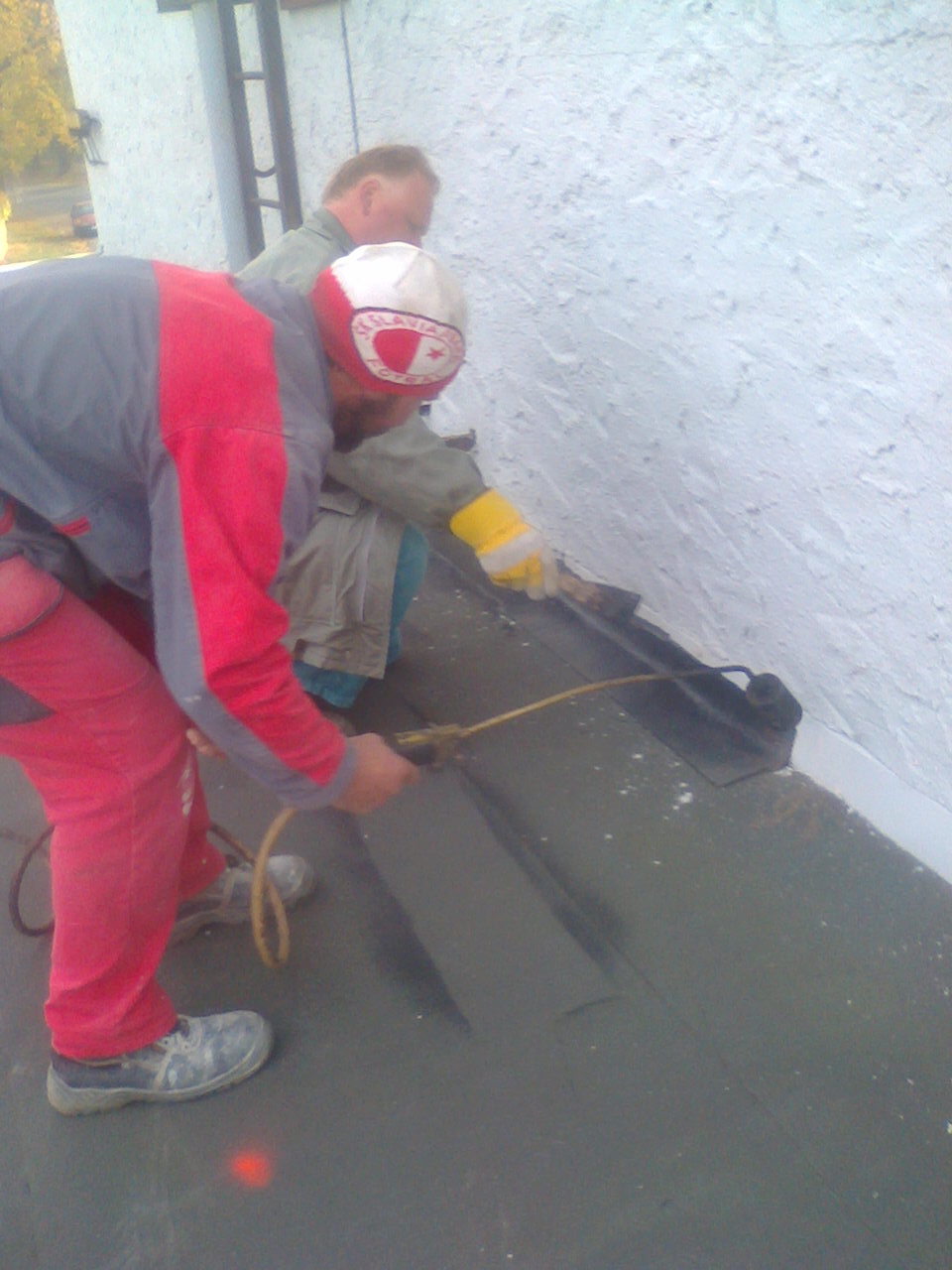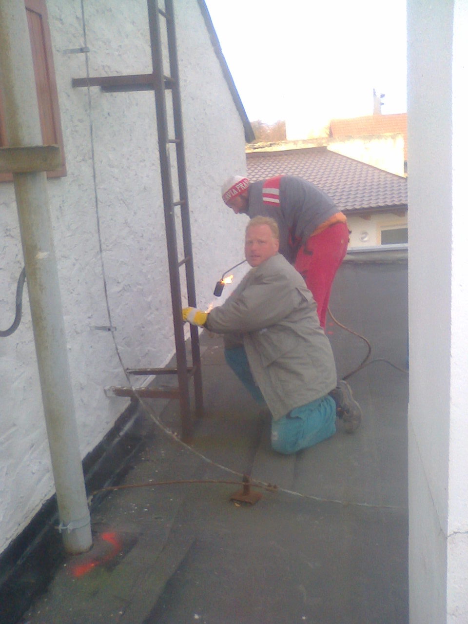 Pan Imbr a Kratina opravují před zimou střechu na hasičské zbrojnici v Peruci